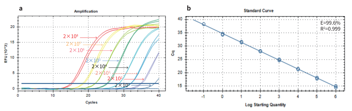 對濃度范圍為 2×101~2×108 copies/μl 的某 DNA 病毒陽性質(zhì)粒,用GenStar #A392 進(jìn)行 qPCR 檢測,結(jié)果顯示,GenStar #A392 可檢測出最低 DNA 量為 20 copies/μl。