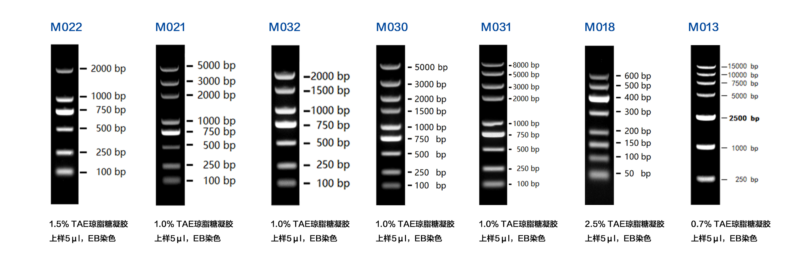 本產(chǎn)品為預(yù)混有 1× 上樣緩沖液的即用型 DNA 分子量標(biāo)準(zhǔn),由 7 條線狀雙鏈 DNA 條帶組成,適用于對 250-15000 bp 的雙鏈 DNA 分子大小的估算和粗略定量。本產(chǎn)品的 7 條帶分別為 250、1000、2500、5000、7500、10000 和 15000 bp。其中 2500 bp 條帶濃度最大,為 20 ng/µl,其余條帶濃度約為 10 ng/µl。