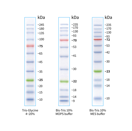 本產(chǎn)品由跨度從 10-245 kDa 的 12 種高度純化預(yù)染的重組蛋白質(zhì)組成,各條帶濃度約為 0.1-0.4 mg/ml。其中 25 kDa 條帶為綠色預(yù)染條帶,75 kDa 條帶為紅色預(yù)染條帶,方便判斷各個(gè)條帶的準(zhǔn)確位置。本產(chǎn)品適合作為 SDS-PAGE 電泳時(shí),變性蛋白樣品的分子量參照,并可實(shí)時(shí)觀察蛋白樣品的電泳分離狀況,也可用于檢測 Western blot 的轉(zhuǎn)膜效率。由于共價(jià)結(jié)合的染料會(huì)影響蛋白質(zhì)分子的電泳遷移率,本產(chǎn)品僅適于粗略地估計(jì)目的蛋白樣品的分子量。