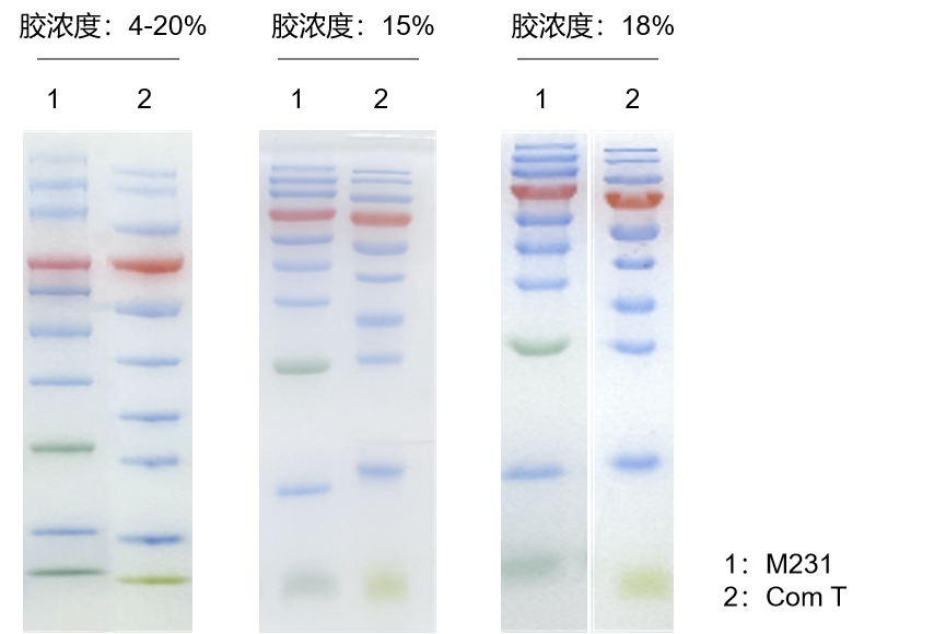 分別使用GenStar #M231、Com T 在不同濃度凝膠中進(jìn)行電泳測試,上樣量 5 μl、電壓 200V、電泳 45 min。結(jié)果顯示,GenStar #M231 電泳條帶清晰,電泳遷移率和小條帶清晰度與 Com T 有差異,效果與 Com T 相當(dāng)。