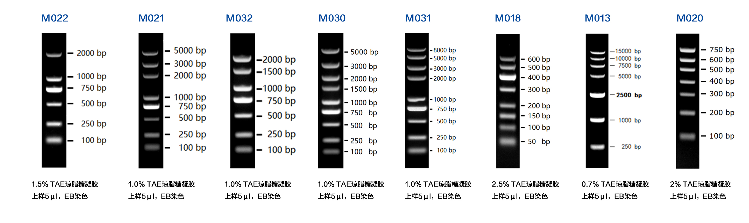 本產(chǎn)品為預(yù)混有上樣緩沖液的即用型 DNA 分子量標(biāo)準(zhǔn),由 8 條線狀雙鏈 DNA 條帶組成,適用于對(duì) 100-5000 bp 的雙鏈 DNA 分子大小的估算和粗略定量。本產(chǎn)品的 8 條帶分別為 100、250、500、750、1000、2000、3000 和 5000 bp。其中 750 bp 條帶濃度最大,為 100 ng/5 µl,其余條帶濃度約為 50 ng/5 µl。