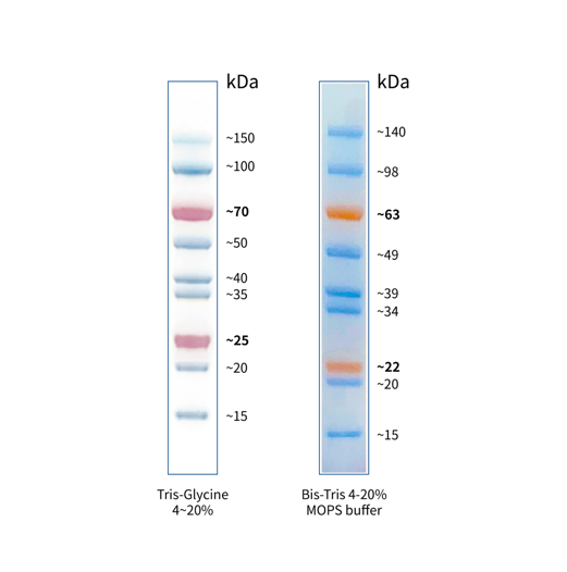 本產(chǎn)品由跨度從 15-150 kDa 的 9 種高度純化的橙色、藍(lán)色預(yù)染蛋白質(zhì)組成。其中 25 kDa 條帶和 70 kDa 條帶為橙紅色預(yù)染條帶。本產(chǎn)品適合作為 SDS-PAGE 電泳時(shí),變性蛋白樣品的分子量參照,并可實(shí)時(shí)觀察蛋白樣品的電泳分離狀況,也可用于檢測 Western blot 的轉(zhuǎn)膜效率。由于共價(jià)結(jié)合的染料會(huì)影響蛋白質(zhì)分子的電泳遷移率,本產(chǎn)品僅適于粗略地估計(jì)目的蛋白樣品的分子量。