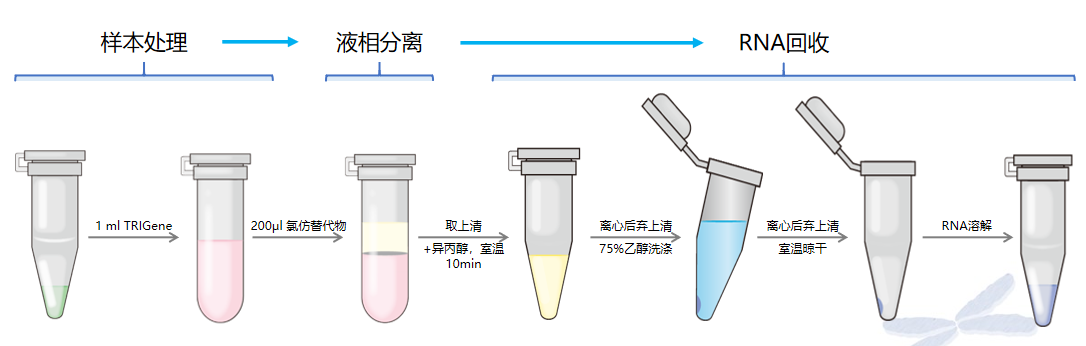 TRIGene Plus 是基于 TriZol 原理制備的一種通用總 RNA 提取試劑。其原理是利用異硫氫酸胍/酚,快速裂解細(xì)胞,溶解細(xì)胞內(nèi)含物,抑制核酸酶活性;而后加入 RNA 抽提試劑(RNA Extraction Reagent)去除雜蛋白,RNA 保留在上層水相中,分離后可用異丙醇沉淀回收獲得。采用 RNA Extraction Reagent 替代了氯仿進(jìn)行 RNA 抽提,上下分相更加清晰且操作安全性更高。使用本產(chǎn)品提取 RNA 純度高,完整度好,產(chǎn)量媲美傳統(tǒng)氯仿法抽提,可直接用于 RT-PCR、Northernblot、dotblot、polyA 篩選、體外翻譯、RNase 保護(hù)實(shí)驗(yàn)和分子克隆等一系列操作。