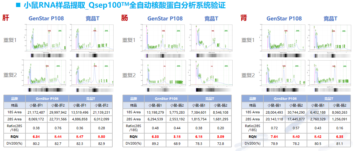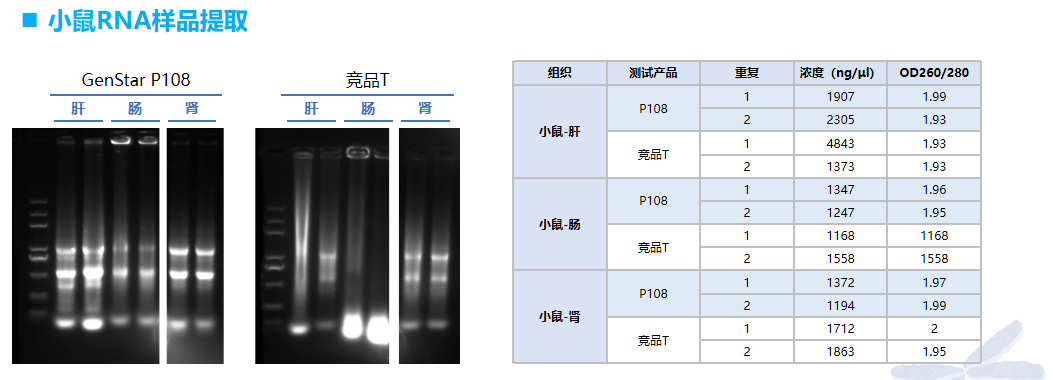 P108 可有效對(duì)小鼠不同器官組織進(jìn)行 RNA 提取,其提取得率與競(jìng)品 T 相當(dāng),提取的 RNA 完整度優(yōu)于競(jìng)品 T。