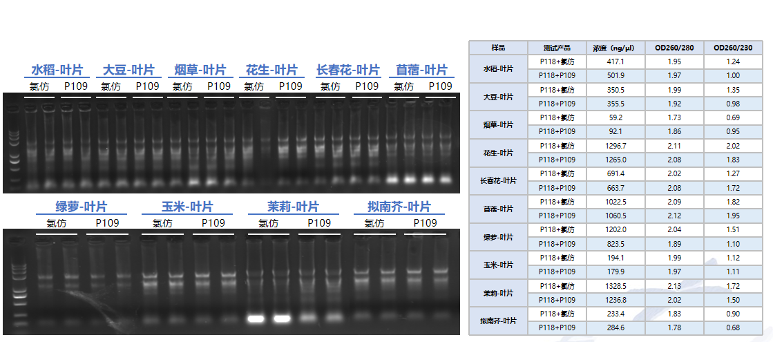 P108 采用 TRIGene +氯仿替代物,對(duì)于多種不同植物類型,其提取效果與使用氯仿的相當(dāng),可在 RNA 抽提時(shí),代替氯仿使用。