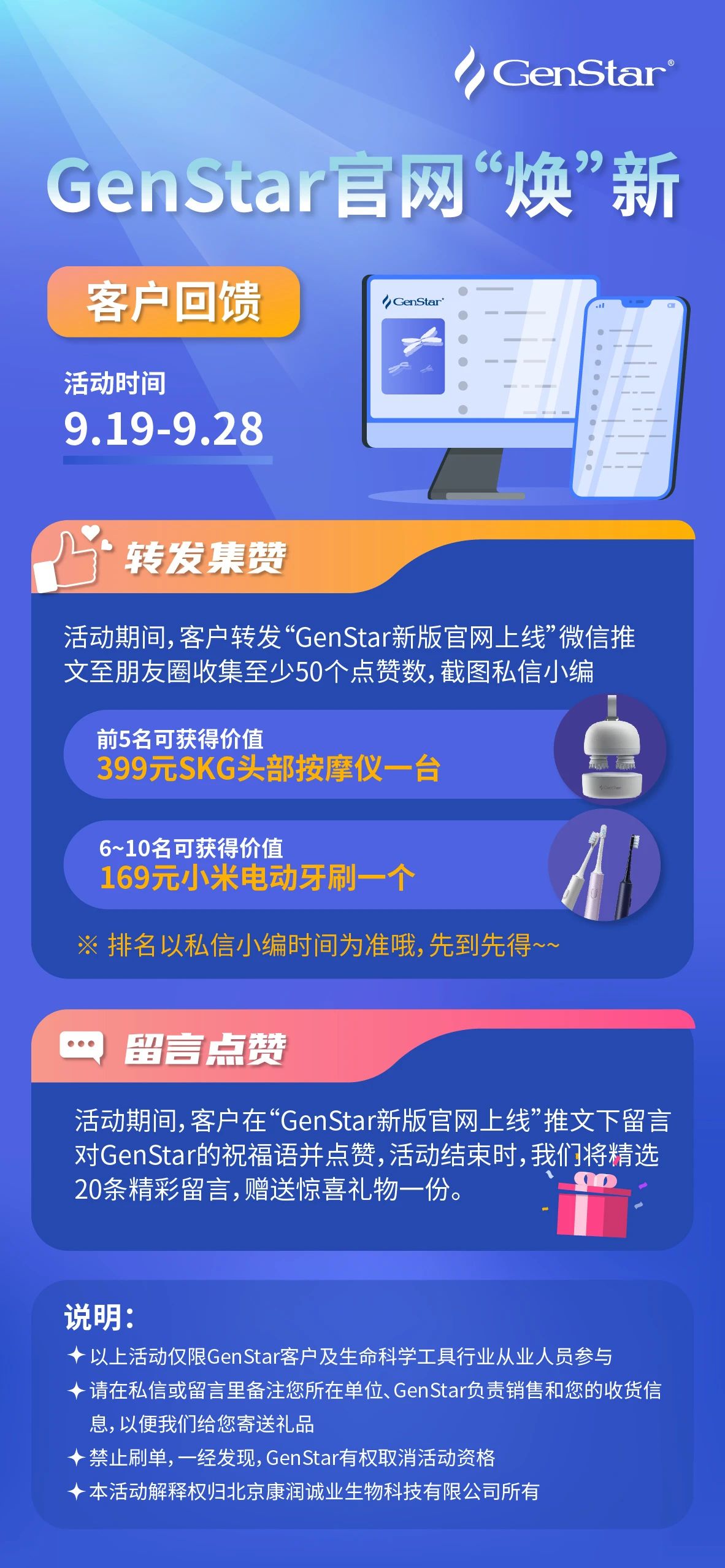 1. 轉(zhuǎn)發(fā)GenStar公眾號(hào)推文(可點(diǎn)擊此處跳轉(zhuǎn))至朋友圈點(diǎn)贊數(shù)滿50,截圖私信GenStar公眾號(hào)鎖定禮品,滿24h后再次截圖并備注單位,負(fù)責(zé)銷售和收貨信息。無(wú)文章保留24h截圖視為棄權(quán),獲獎(jiǎng)?wù)唔樠右晃弧?/span>