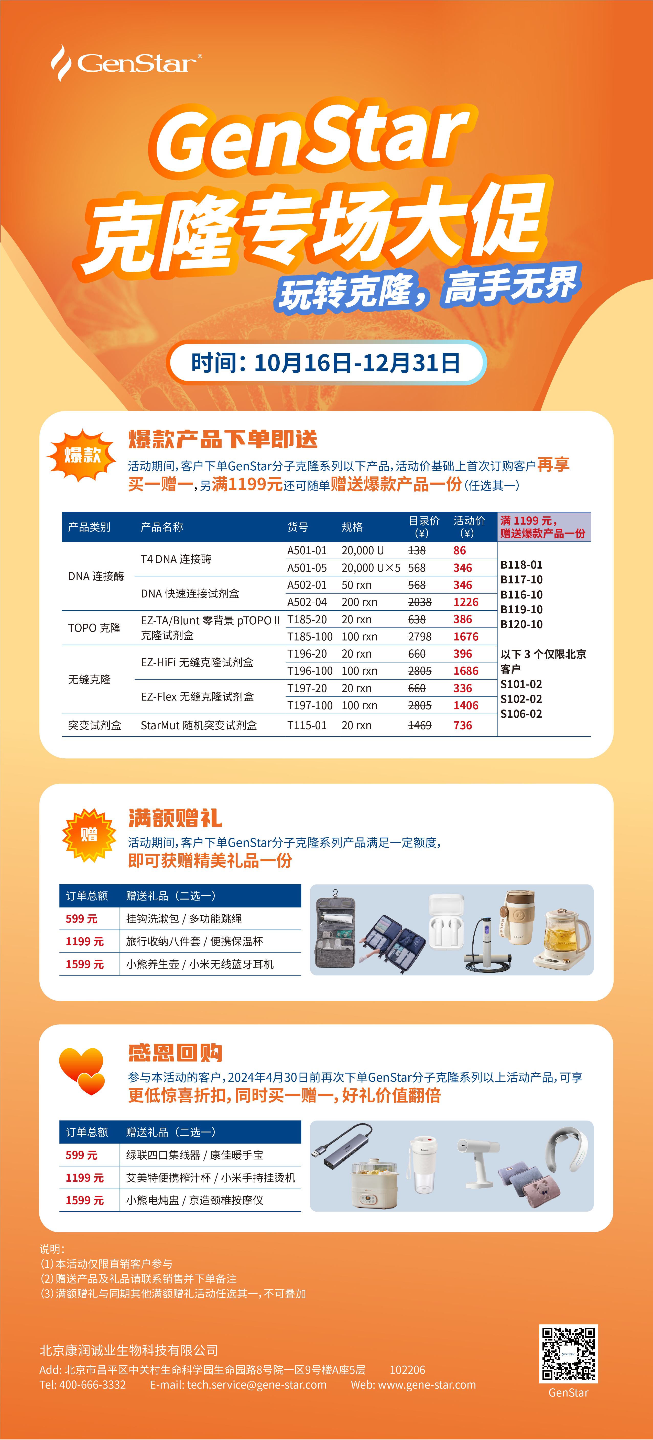 分子克隆是分子生物學(xué)的一項(xiàng)核心技術(shù),發(fā)展至今,從經(jīng)典的酶切酶連法、快捷簡單的TOPO克隆法到靈活高效的同源重組克隆,都有其各自的優(yōu)勢和應(yīng)用場景。GenStar的分子克隆系列產(chǎn)品經(jīng)過不斷優(yōu)化和迭代,自上市以來,備受眾多客戶的認(rèn)可和支持。為回饋新老客戶,我們特推出分子克隆系列產(chǎn)品專場促銷,助您的分子克隆實(shí)驗(yàn)脫離“靠運(yùn)氣”的魔咒,從入門到精通。
