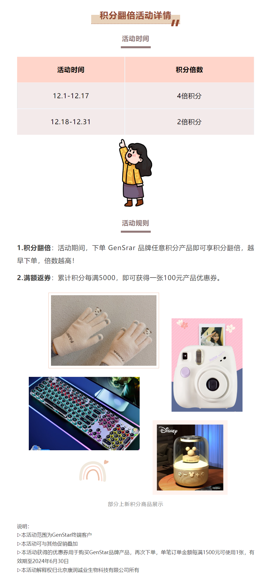 同時,12.1-12.31 下單 GenStar 品牌產(chǎn)品,還有積分翻倍加持,越早下單,翻倍越高,最高可獲得 4 倍積分哦。積分商城商品持續(xù)上新中......快來下單領(lǐng)取積分,兌換您的心水好物吧~